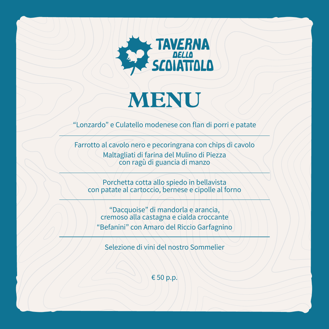 Protagonisti della tavola imbandita di fronte a un grande camino acceso saranno piatti tipici e prodotti del territorio, come i maltagliati di farina del Mulino di Piezza, la porchetta cotta allo spiedo in bellavista e i biscotti Befanini accompagnati dall'Amaro del Riccio Garfagnino a fine pasto.