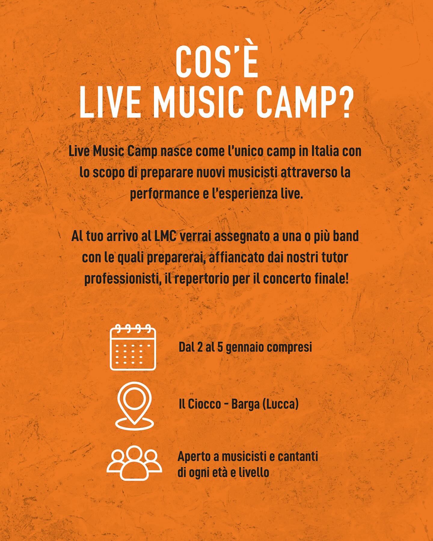 Dal 2 al 5 gennaio 2026, il Live Music Camp ti aspetta per iniziare il nuovo anno con energia, entusiasmo e nuove consapevolezze musicali. Saranno quattro giorni intensi, da vivere fino in fondo, tra note, emozioni, nuove amicizie e tanta crescita personale e artistica.